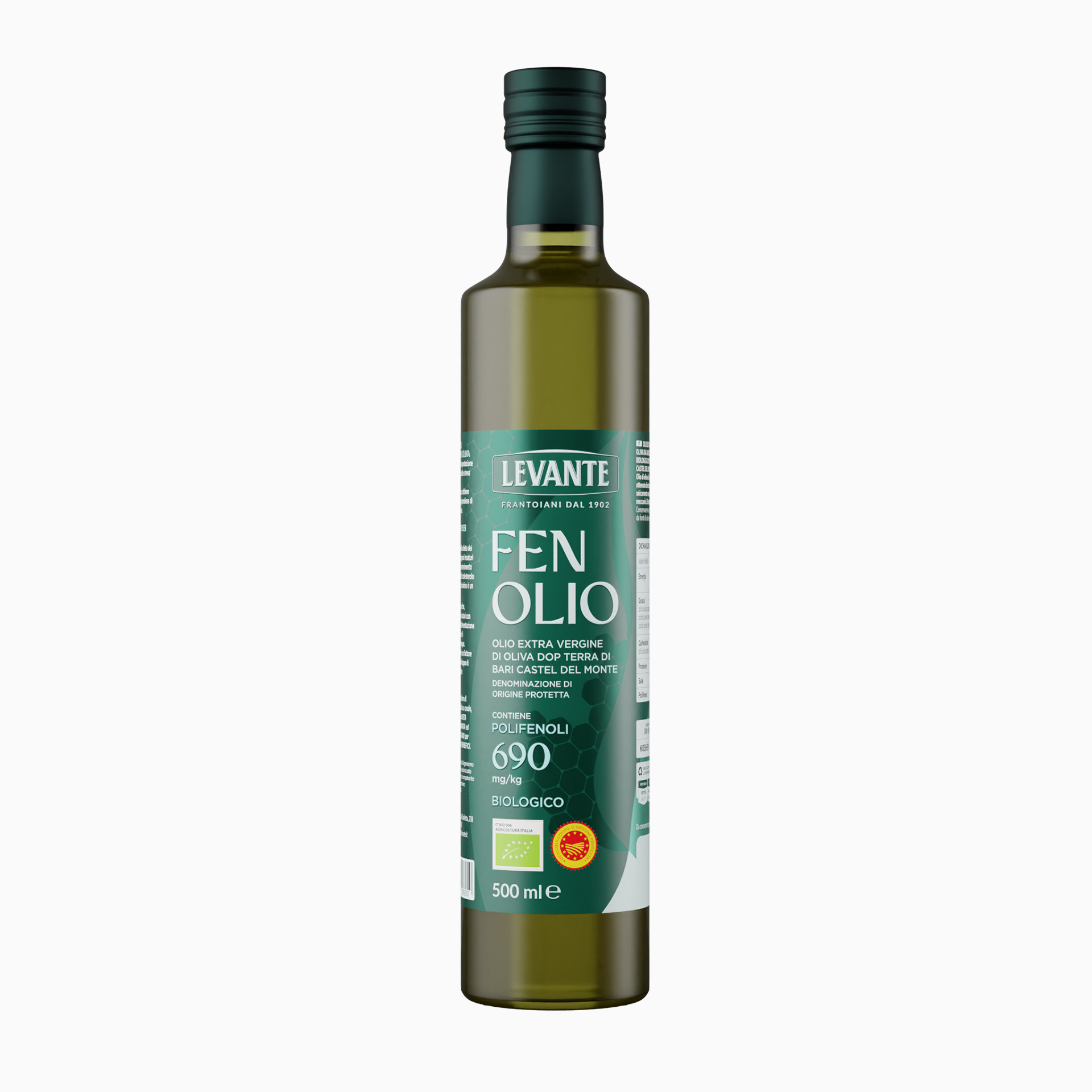 Fenolio is a high-quality organic extra virgin olive oil with PDO certification from Terra di Bari Castel del Monte, made predominantly from selected Coratina olives.